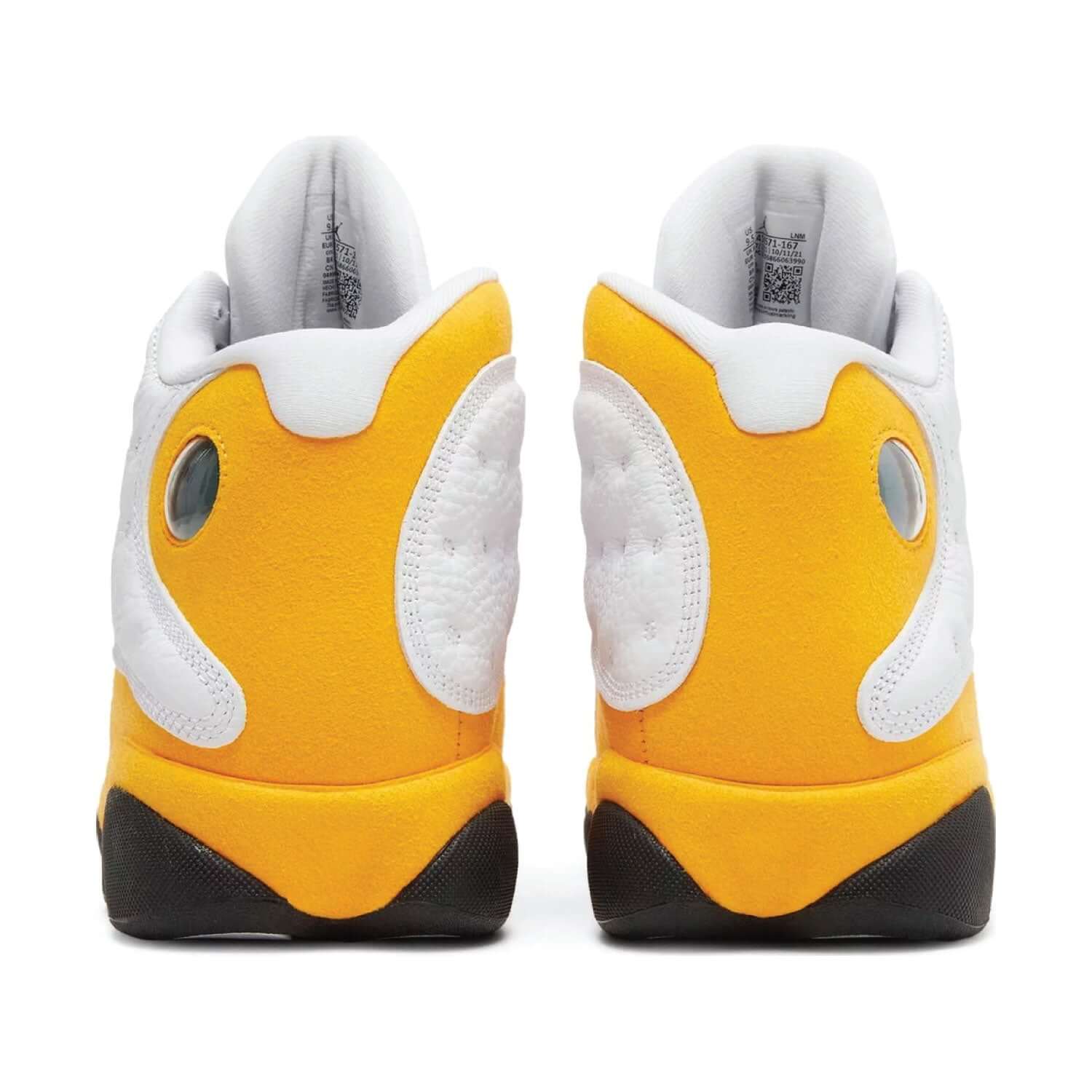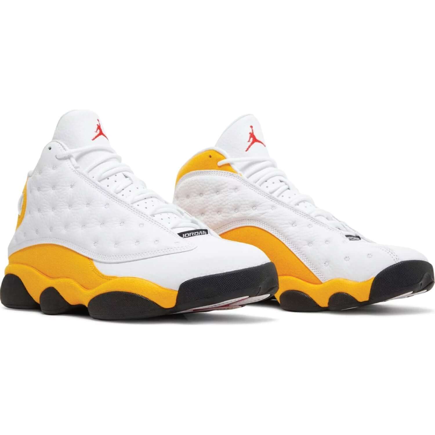 The Air Jordan 13 Retro ‘Del Sol’ combines sunny accents with OG-inspired color blocking and materials. The mid-top carries a white leather upper with dimpled overlays in matching white tumbled leather. A crimson Jumpman logo graces the tongue, while a green-tinged holographic cat eye adorns the lateral ankle. Yellow synthetic suede wraps the midfoot, heel, and lightweight Phylon midsole, fitted with Zoom Air cushioning in the forefoot and heel. Underfoot, the black panther-paw outsole features herringbone rubber pods and a carbon fiber shank plate.